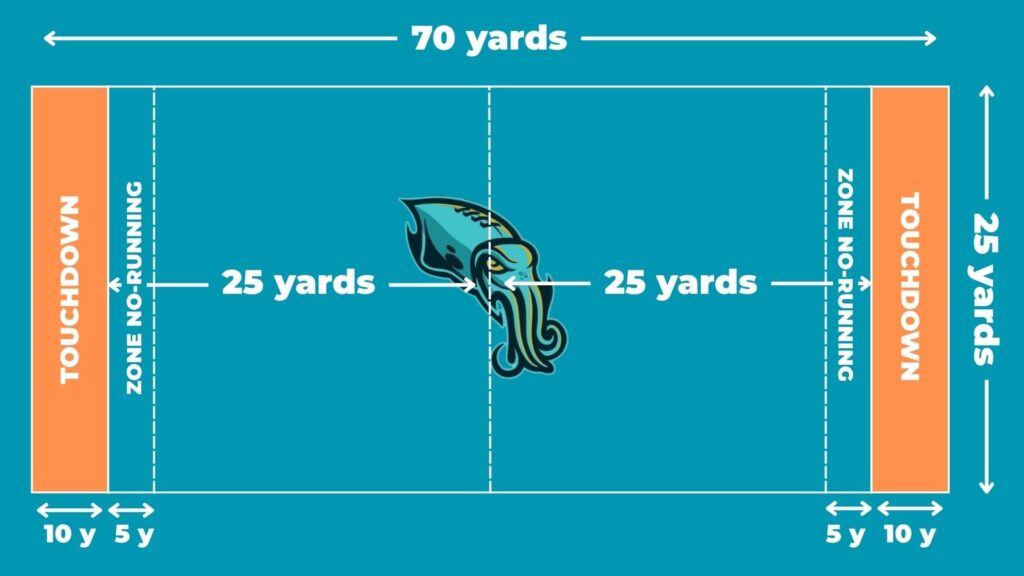 Un match dure généralement 2 x 20 minutes. Contrairement au football américain, il n’y a pas de coups de pied d’engagement (kickoff) : le jeu commence à 5 mètres de sa propre ligne de but. Le rythme est rapide, fluide et stratégique.